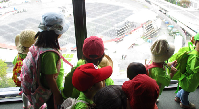 大きいクラスの子供たちは路面電車に乗ってまずは「おりづるタワー」へ。車で先に到着していた小さいクラスの子供たちと合流して展望台にあがり、日ごろの目線から見える「平和公園」や「原爆ドーム」とは違う景色を楽しんだ後、いよいよガラス貼りのタワーの中へ。