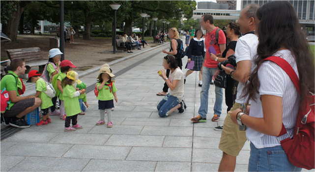 おりづるタワーの後は「平和公園」へ移動して、観光やビジネスで広島を訪れている外国の人に話かけて、